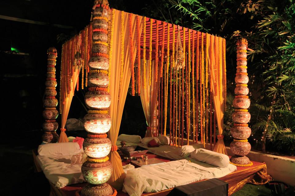 Size 10 ft X 10 ft decoration includes mantap, flower decoration, hanging lights and chilly lights, carpet, gaddi, flower stands